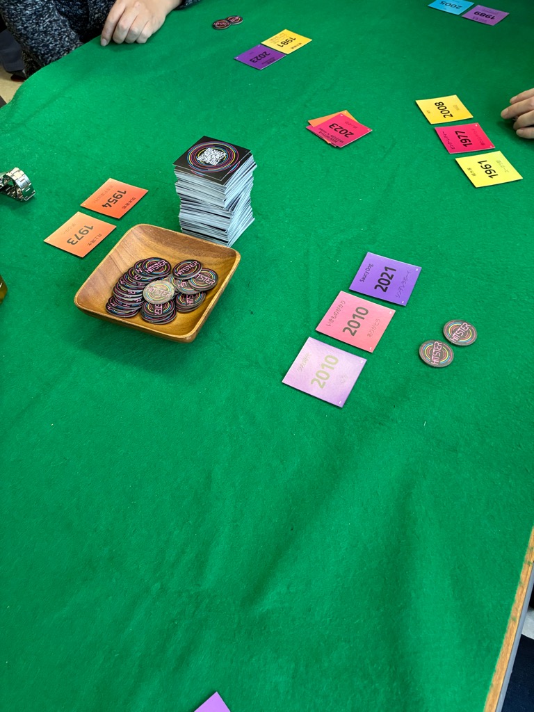 ③ヒットスター〜これはヒットソングを年代順にソートして得点を競うゲーム。gpのホームページを見て欲しくなったゲーム。持って来てくれてありがとう‼️予想していた通り、良ゲーム。予想外に聞いたことがあるのに曲名がわからない曲ばかり。まぁ勝てそうもないけど楽しいゲームでした。